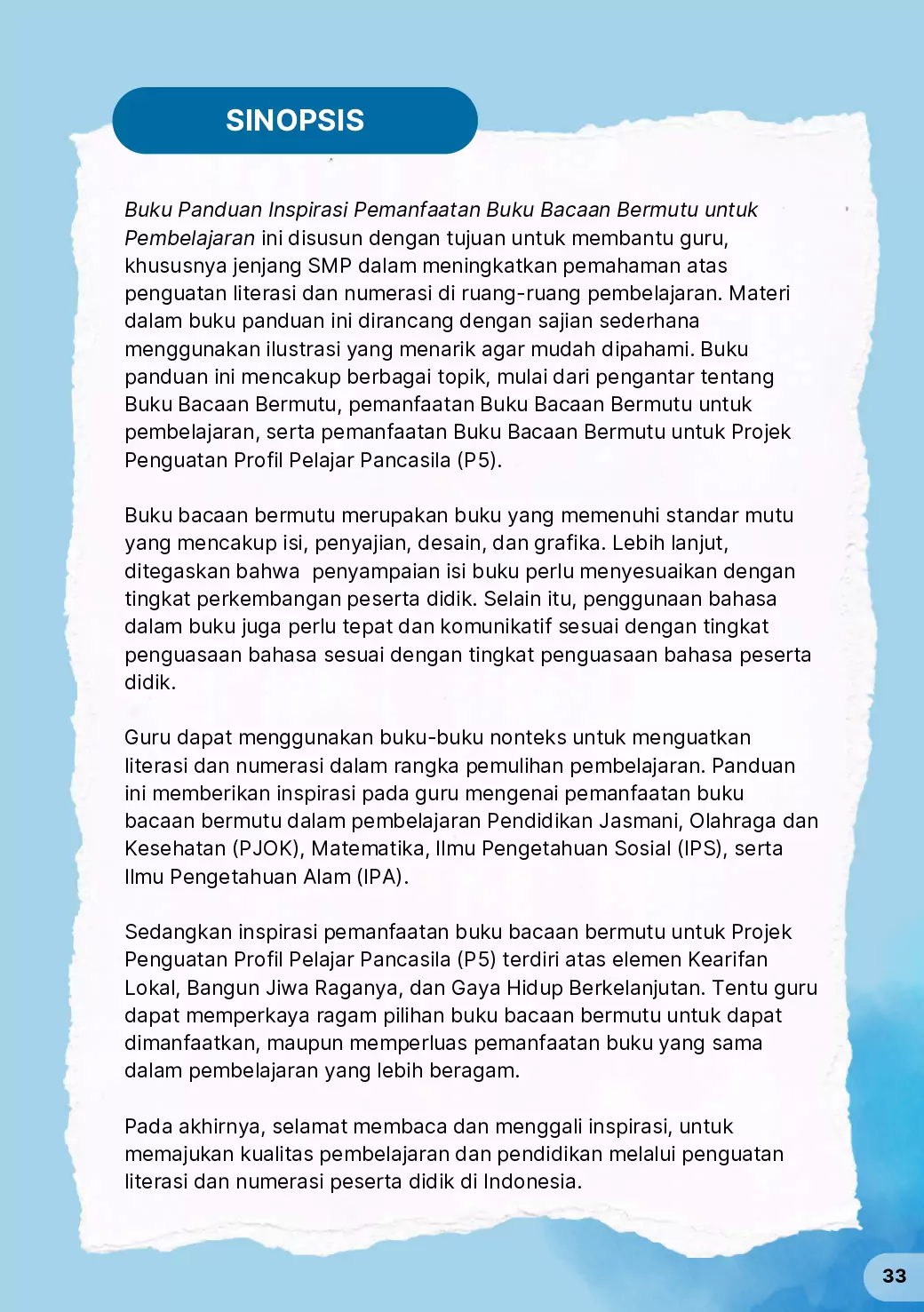Panduan ini disusun untuk membantu para pendidik dalam memilih, menggunakan, dan memanfaatkan buku bacaan yang berkualitas dalam kegiatan belajar mengajar. Tujuan utama dari panduan ini adalah: